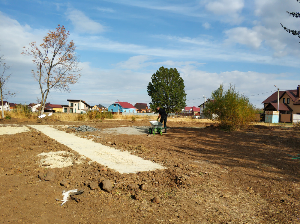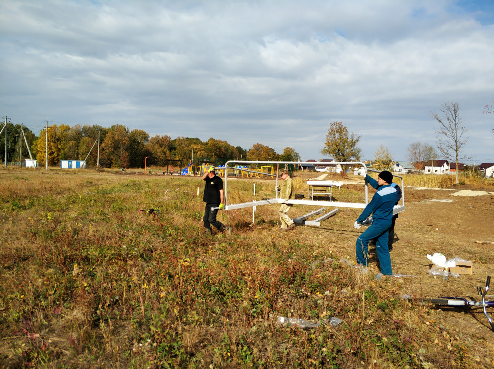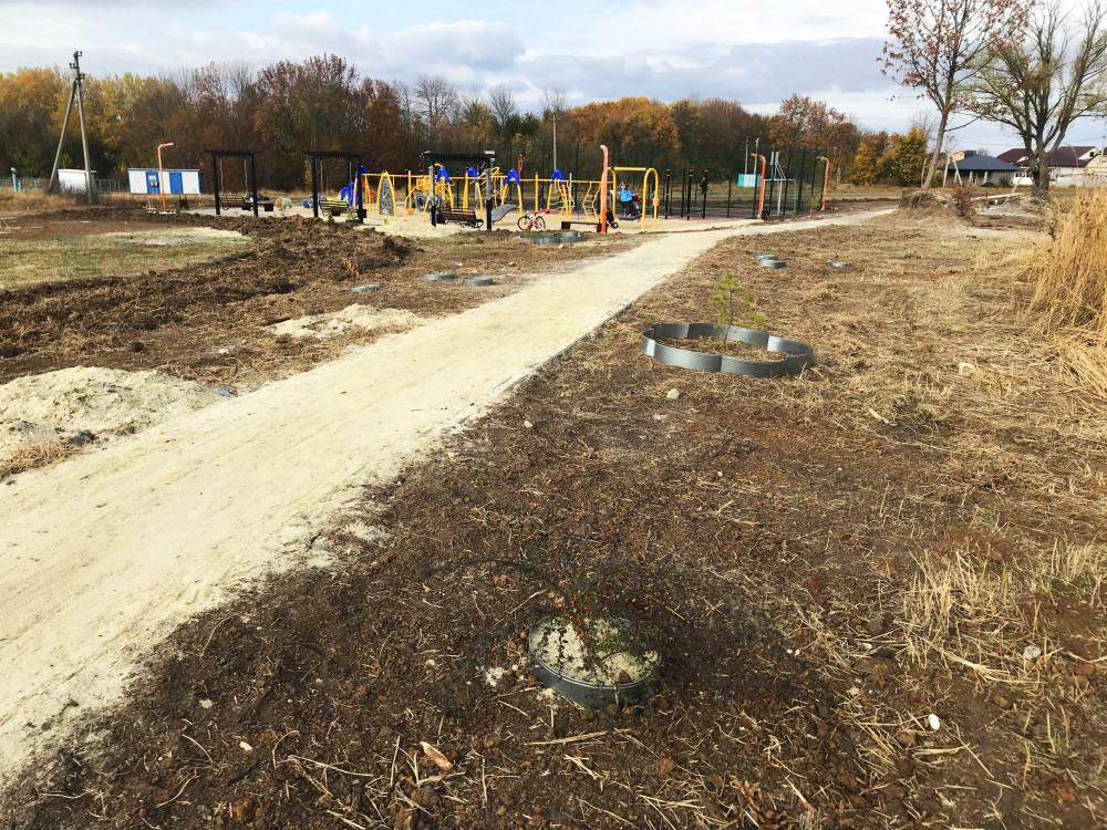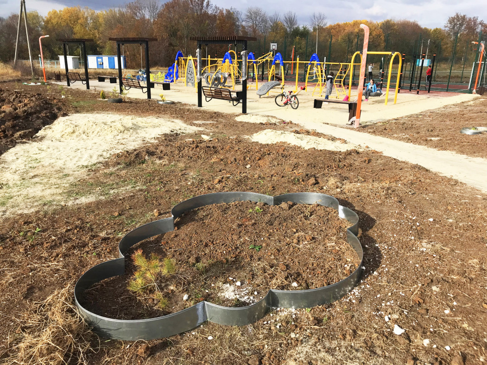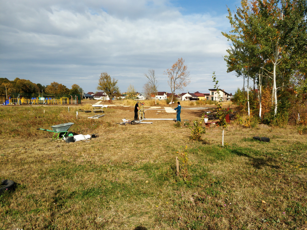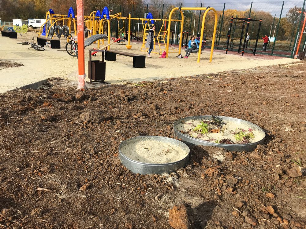 Собрались, что бы установить спортивное оборудование, засыпать только что построенную тротуарную дорожку из плитки песком, высадить вокруг новенькой многофункциональной детской площадки деревья и начать выполнение задуманного ранее проекта по благоустройству "По дороге с облаками". На прошлых выходных жилели уже успели организовать небольщую яркую клумбочку с хвойниками, высадили разного плана многолетние цветы.